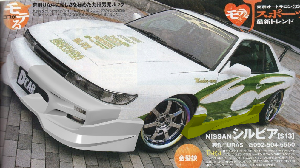 Uras type-s kit for nissan silvia s13, photomatched to irl dimensions. Front, rear bumpers, side skirts and front custom grill included. It’s one of my old models so topology is not the best, but it works and has a decent shading. Don’t buy if you mind.